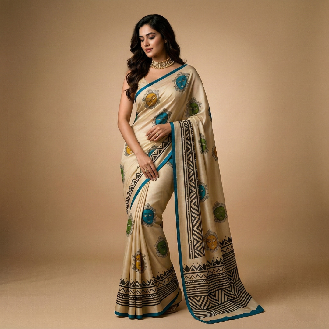Aadiro is an artistic celebration of India’s timeless tribal heritage, brought to life through vibrant folk-art–inspired face motifs. Hand block-printed meticulously on 100% Pure Silk, this saree blends cultural storytelling with luxurious drape and craftsmanship.