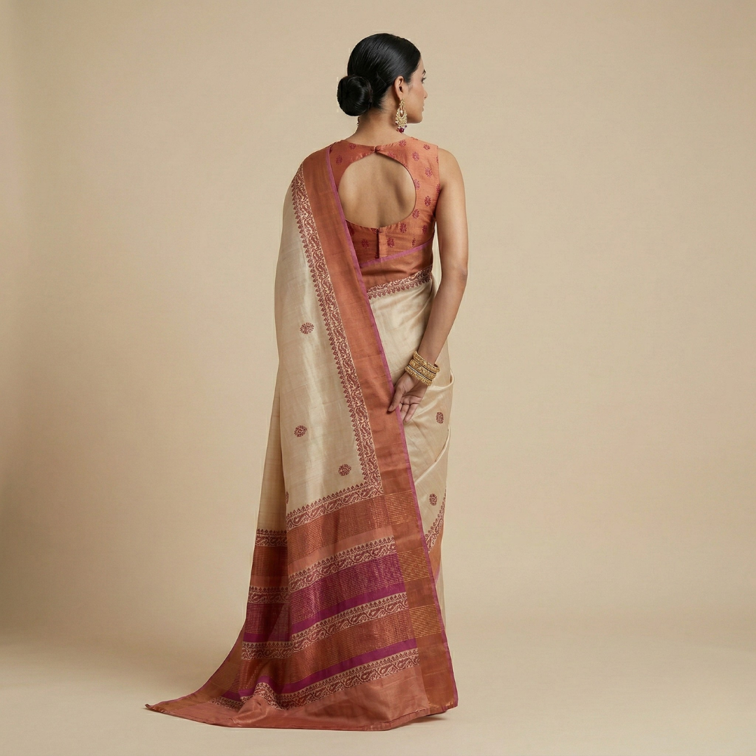 Immerse yourself in timeless elegance with Charita, a masterpiece woven from Pure Gachi Tussar Silk and certified with the prestigious Silk Mark for authenticity. Designed for those who appreciate traditional richness with a modern aesthetic, this saree features an exquisite handwoven jori border paired with classic buti motifs, creating a harmonious blend of heritage and sophistication.