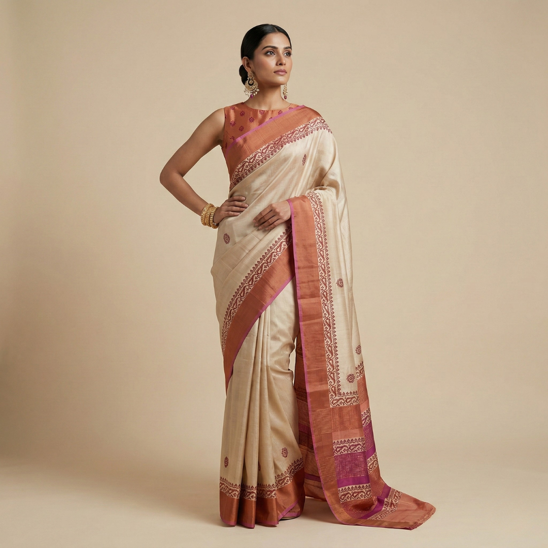 Set in an elegant palette of golden beige, copper, and royal magenta, Charita radiates warmth and regal charm. The saree drapes with a naturally lustrous, graceful flow—making it an impeccable choice for weddings, festive gatherings, and cherished cultural celebrations.