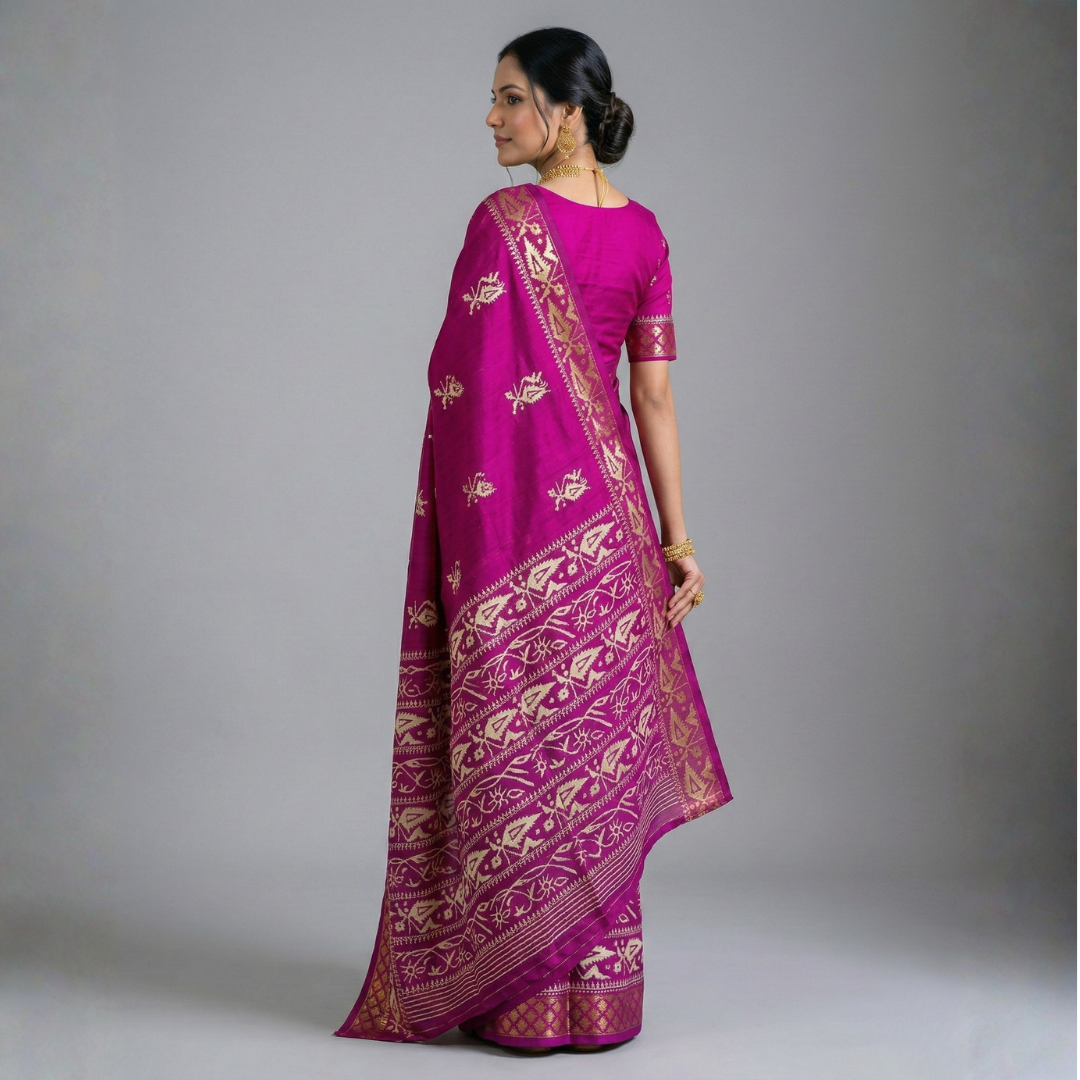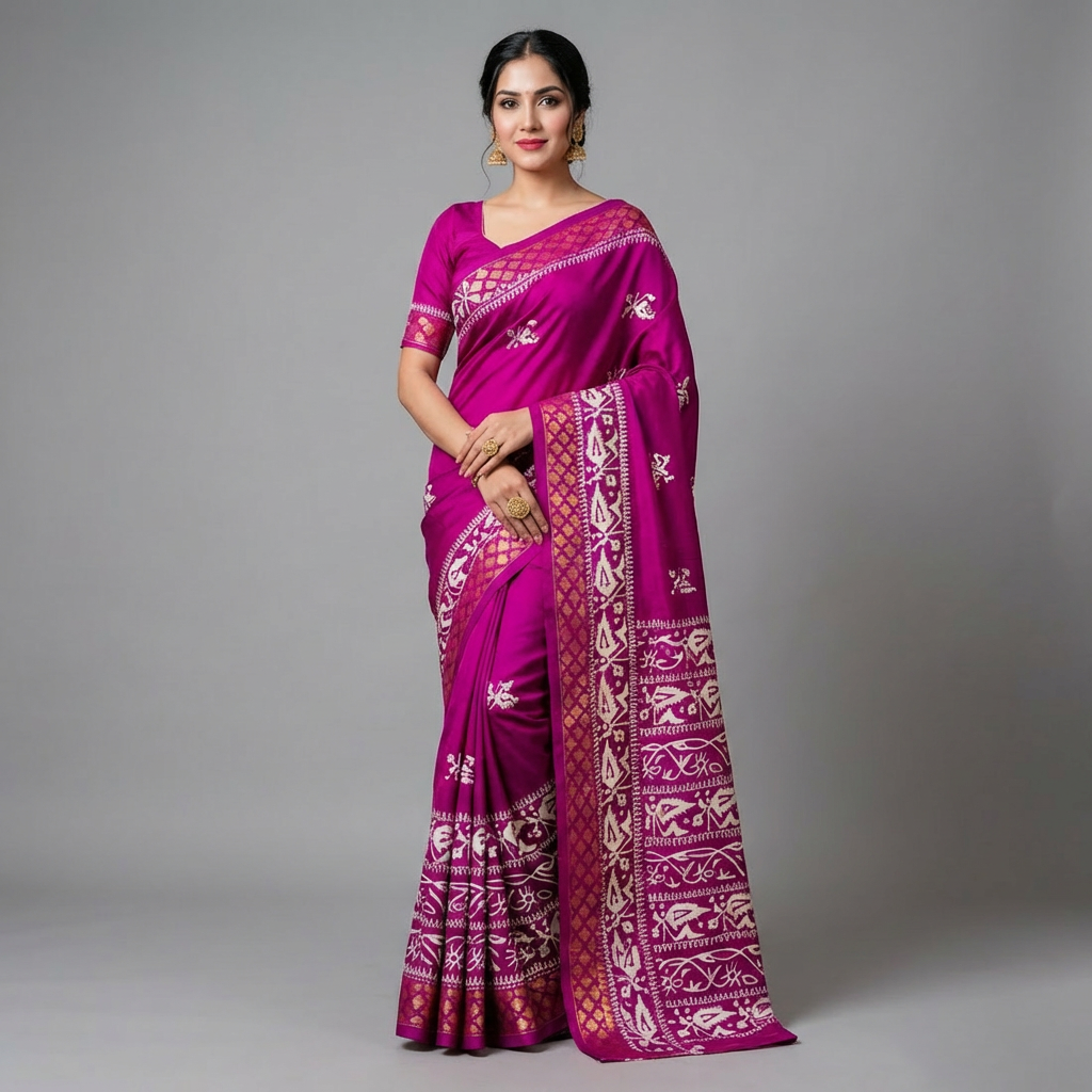 The saree features delicate contrast white threadwork motifs woven across a bold magenta purple base, creating a striking interplay of color and craftsmanship. Traditional borders add a touch of timeless charm, making this saree a refined choice for festive occasions, cultural celebrations, and elegant evening gatherings.
